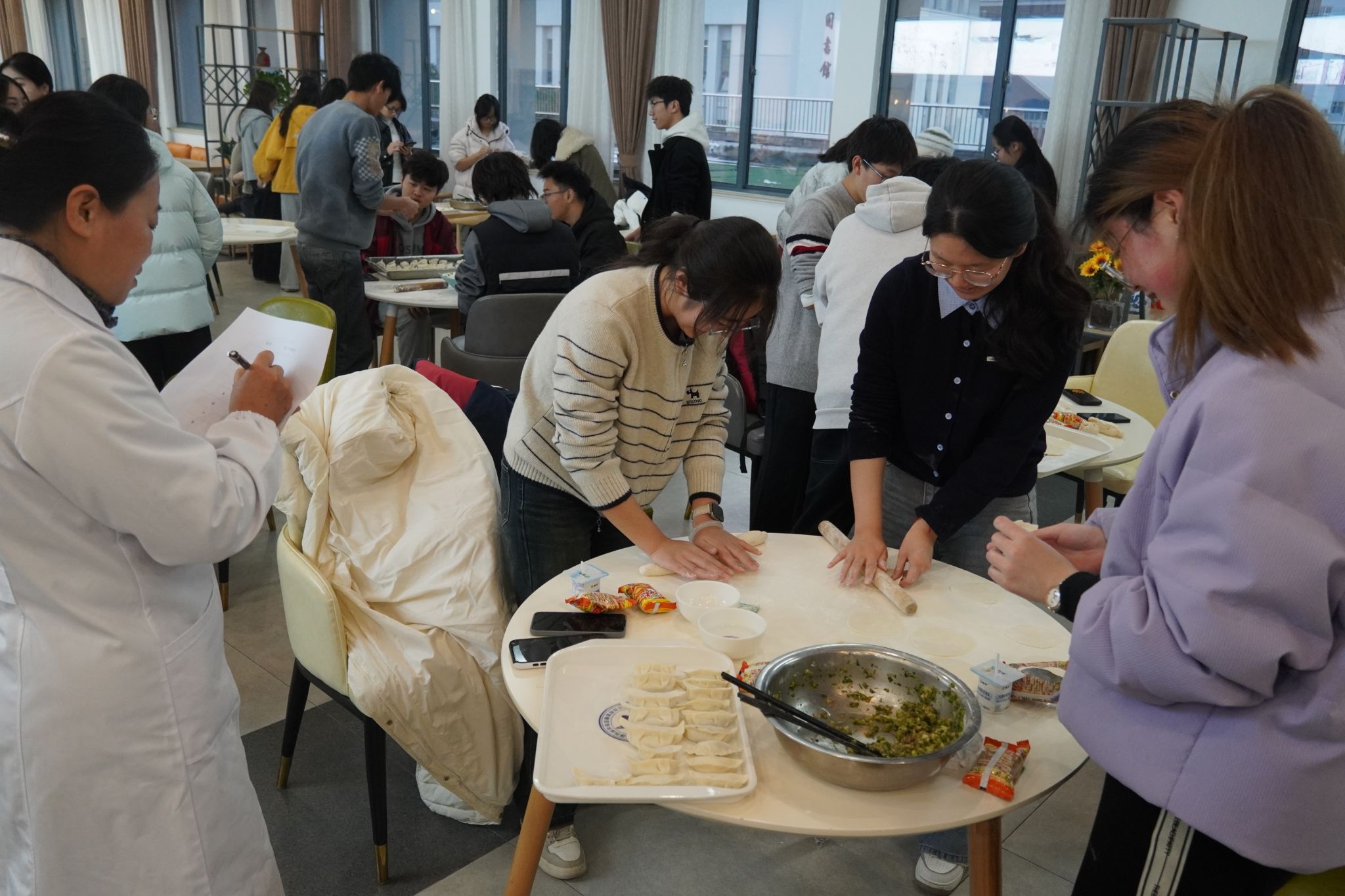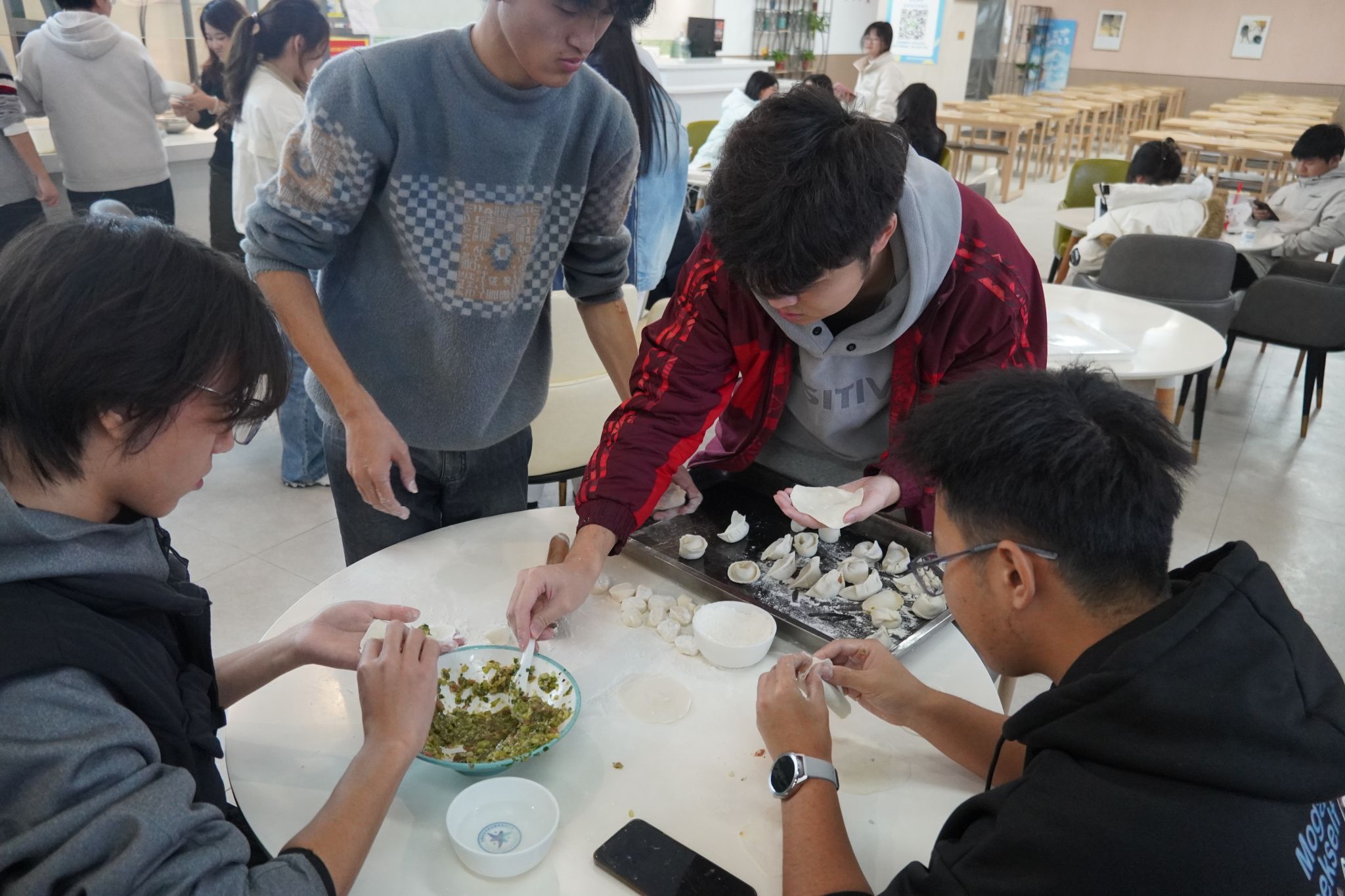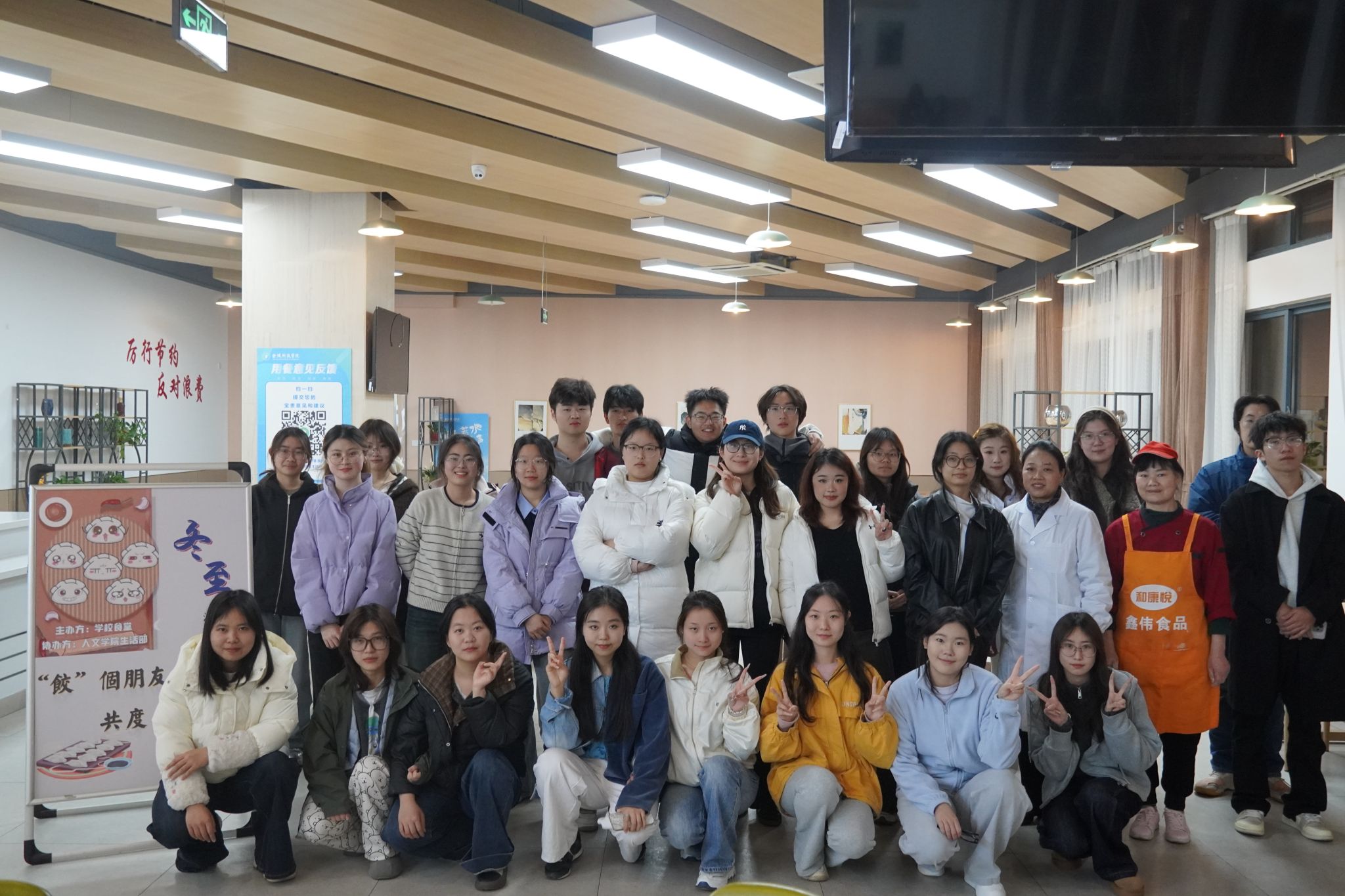 活动伊始,冬至成语你划我猜的趣味游戏热闹开场,游戏融入了冬至习俗、历史渊源等文化知识,让学生们在轻松氛围中深化了对冬至节气的理解。“包饺子”环节前,食堂阿姨们为同学们提供了面粉、馅料等食材,同学们需要手工和面、自主调制馅料。现场制作氛围十分热烈,同学们分工协作,和面、擀皮、调馅、包饺子,笑语不断。温暖驱散了冬日的寒意,片片情谊在合作间流动。活动最后,同学们一同品尝了劳动成果,并留下了的冬日温暖合影。