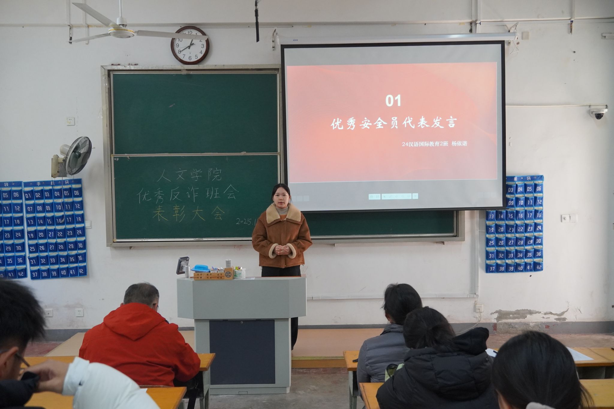 会议伊始,张老师传达了校防范电信网络诈骗会议精神,汇报了学院本年度安全工作。随后,两位优秀安全员分享了班级反诈宣传经验。来自24汉语国际教育(2)班安全员杨依诺,提出建立常态化精准宣传机制,注重反诈班会互动体验,创新教育形式让防范电信诈骗的思想内化于心。来自25汉语国际教育(2)班安全员李圆圆,认为用真实案例分享和互动提问改进班会形式,鼓励同学积极参与,更能强化反诈教育效果。两位同学分享工作经验,为其他安全员树立榜样,提供学习机会。分享结束后,吴书记为获奖班级颁发了荣誉证书。
