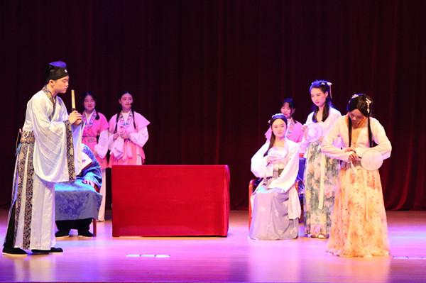 杨文聪的饰演者来自17秘书学(2)班褚杨波同学,其字正腔圆,抑扬顿挫和恰到好处的情绪表现,将剧中杨老爷亦正亦邪的人物形象展现的淋漓尽致。大幕拉下,表演结束,全场观众久久不愿离去,仍沉浸演员们惟妙惟肖的表演中。