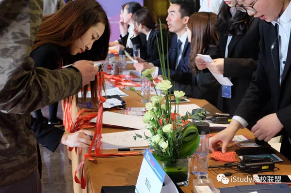 在两天的现场活动中,我校12名学生被分配至中国院校部、国际代理部、海外院校部和会展部,各司其职,协调合作。第一天同学们主要是和工作人员一齐做好来宾接待、签到和指引路线工作,并于大会开幕后在会场中为各位外宾提供翻译、摄像服务。第二天则是分发晚宴入场券和解决一些现场的临时突发问题。每位同学都尽职尽责,积极按照工作人员安排,穿梭于会场间,整个志愿工作的过程忙碌而充实。