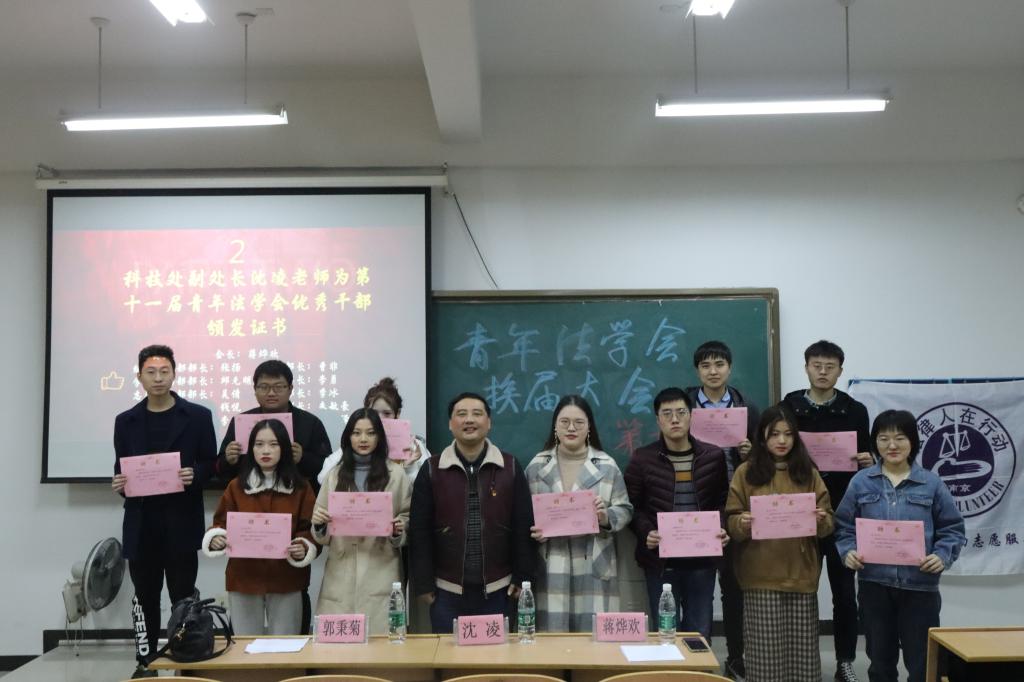 大会伊始,首先由沈凌老师为第十一届青年法学会优秀干部颁发聘书,并由青年法学会指导老师郭秉菊宣读了《第十二届青年法学会理事会成员名单》。随后,第十一届青年法学会会长蒋烨欢对一年来法学会进行了工作总结,不仅表达了对法学会给予自己的莫大成长帮助,而且希望未来的学子们能以此为平台收获更多。新任会长陈飞宇向在场的老师和同学们表达了决心,任职期间会不辞辛劳,为法学会添光加彩!最后,在交流中,两位老师殷切希望法学会同学们能凝心聚力,发挥专业优势,将工作推向新发展。