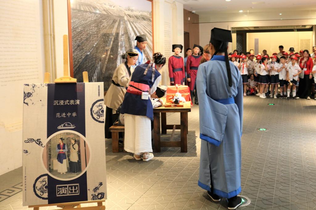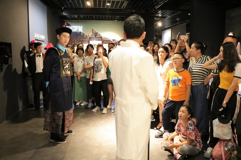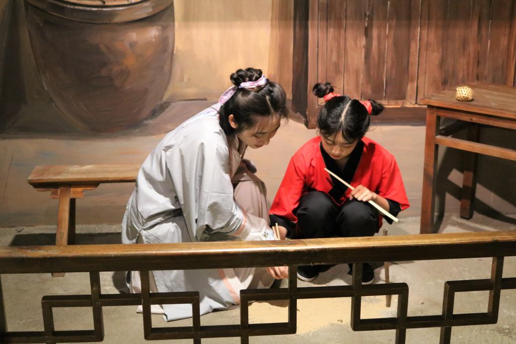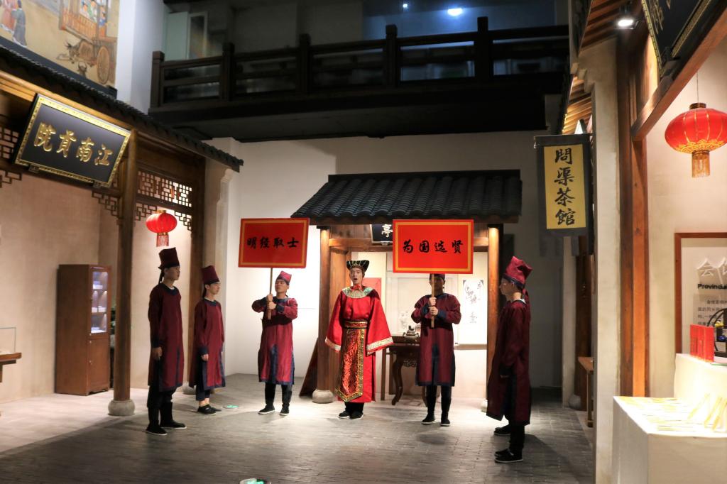 《欧母教子》、《虎门销烟》、《范进中举》和《桃花扇》科举版片段,四部沉浸式情景剧,分别根据博物馆情境和设施特别设置,并采用了与情景相融的沉浸式演出。在接到演出后,指导老师和同学们仅用了20天的时间,编写剧本、分组排练、采买道具,拿出了十二万分的努力去统筹此次表演。每天下午三点至晚九点,沿着参观路线四部剧轮番上演,同学们对角色的人物性格、举止神态、关系处理都拿捏有度,配合博物馆场馆的“舞台背景”,为观众再现了“以荻画地,教以书字”明理的欧母,渲染了严苛的科考场景,展示了浩浩荡荡的“虎门销烟”和荒诞逗趣的“范进中举”。同学们惟妙惟肖的表演,赢得了现场参观者的阵阵掌声。谢幕结束,许多观众久久不愿离场,争相与演员们合影。三天每部剧目平均演出17场,同学们在忘我演出的同时,也不忘利用休息时间在后台复习备考期末,展现了人文学子脚踏实地、勤学善思的良好形象。主办方负责老师在演出结束后说:“同学们真的演得很投入、专业,希望以后还有更多机会合作!”