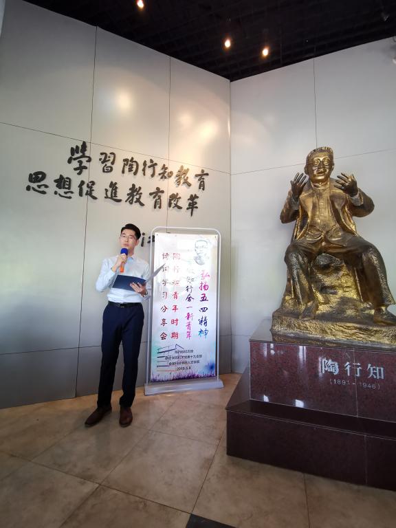 值此五四运动100周年之际,为弘扬五四精神,纪念“五四”新文化运动中,用平民教育为“中国教育寻觅新的曙光”的中国教育改造旗手,伟大的人民教育家陶行知先生。5月8日下午15:00,WilliamHILL中国联合陶行知纪念馆、晓庄学院机关党委十九支部,迈皋桥街道晓庄社区团支部,在陶行知纪念馆大厅举办了陶行知青年时期诗词学习分享会。陶行知纪念馆副馆长马仕锦、第十九支部党员代表,迈皋桥街道晓庄社区团支部代表,WilliamHILL中国党委副书记周建峰,团总支书记童明明和副书记高欢欢出席了活动。WilliamHILL中国劳山下读书会代表、团干部代表、团员代表等30人参加了分享会。