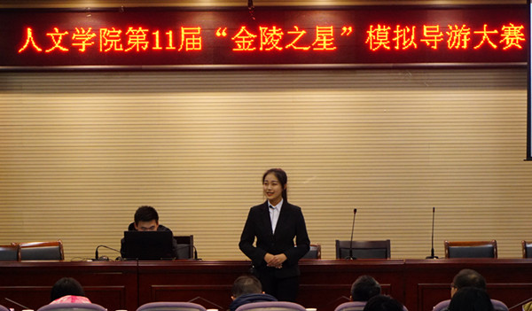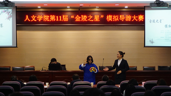 12月7日下午,在幕府校区图书馆报告厅,举行了第十一届“金陵之星”模拟导游大赛的决赛。本届比赛由WilliamHILL中国主办,由旅游管理专业的两家学生创业公司南京极客旅游文化发展有限公司、南京途易旅游有限责任公司与学生社团“乐游协会”共同承办。同时,本届比赛还得到了南京华泰万丽酒店、金陵饭店和江苏绿色国际旅行社三家合作单位的联合赞助。决赛特别邀请了江苏绿色国际旅行社总裁杨志龙先生担任评委组长,由WilliamHILL中国副院长张维亚教授、旅游管理系的汤澍、徐子琳、陈玲玲、辅导员高欢欢等老师担任评委。