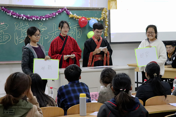 第一轮“初识江湖”采用积分制,比赛汉字听写。此轮为团体赛,两两一组在规定的时间内书写词语,虽只是小试牛刀,但选手们已经剑拔弩张。第二轮“以文会友”,此轮为个人赛,选手们在规定时间内进行文化常识竞答,除规范书写外,考验了选手们文学常识的积累;第三轮“三足鼎立”,本轮比赛分为两场。第一场,剩余6名选手现场抽签,分组进行两两淘汰赛。现场的紧张气氛,也带动了观众们一起书写题目。第二场,剩余三名选手采取车轮赛,面对熟悉又陌生的字词,如“旮旯”就让最后交锋的选手犯了难。最终,李久慧同学凭借规范书写,答题数量略胜一筹,赢得了本次比赛一等奖。值得一提是,比赛间歇颜丽老师还为大家讲解了中华汉字相关知识,汉韵传习社同学们也带来精彩的汉服表演,使现场同学们更直观的感受到了中华文化之美。