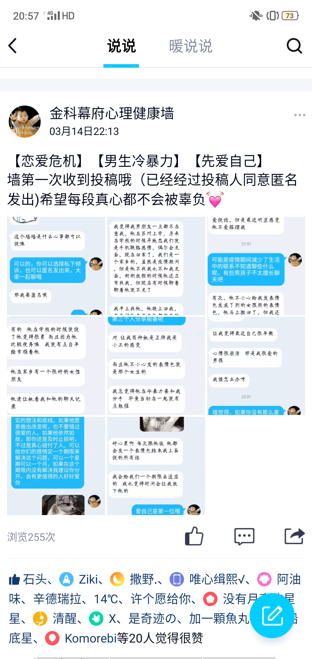 公众号中关于“恋爱危机,先爱自己”的投稿活动,吸引了众多同学参与,大家各抒己见,表达了树立正确恋爱观的重要性。通过心理健康墙的建立,为同学们提供倾诉和交流的空间,同时给予帮助,疏导负面情绪。疫情期间,通过“金科人文在线”公众号向同学们推送心理科普文章,鼓励大家同学们及时调积极调适情绪,变“被动宅”为“主动宅”,发现生活中的积极力量,构建新希望。