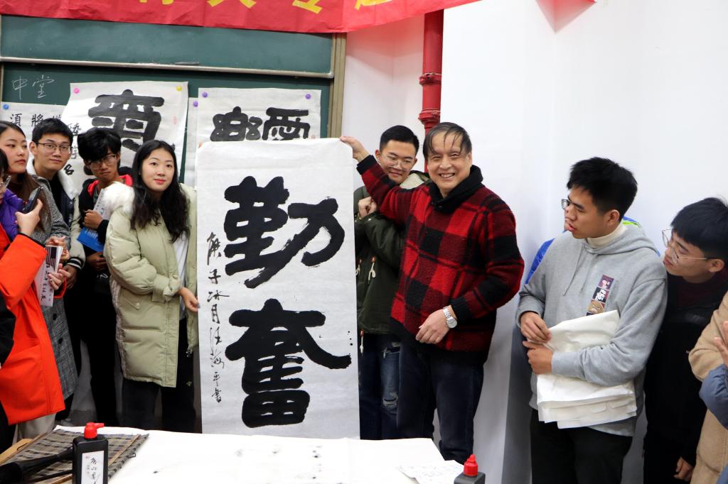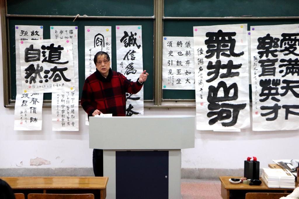 讲座伊始,吴书记向大家介绍了汪海平老师的书法成就,张维亚院长、赵步阳副院长接受了汪老师向我院捐赠的“校训校风”书法作品。作品笔力遒劲,铁画银钩,赢得了现场同学们的阵阵掌声。随后,周建峰副书记为汪老颁发学生社团指导老师聘书,讲座正式拉开帷幕。汪老趣谈书法,他围绕着书法的分类,展现了不同字体的书法之美;他围绕着自身经历,诉说了书法之魅力,已经成为中外文化交流中华优秀传统文化的名片;他围绕着书法的技巧,呈现了书法之难,冰冻三尺非一日之寒,鼓励同学们勤奋刻苦学习,扎实专业。最后,汪老现场作字,以书法会友,以书法育人,翰墨飘香,落笔成韵。