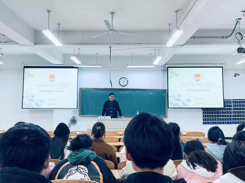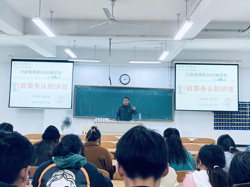 为行政管理专业学生深入了解和掌握行政管理的基本理念和实务操作技能,williamhill威廉希尔行政管理系于2021年12月20日15:00在幕府校区图教楼B205教室,面向行政管理系2020级学生开展了一场理论与实务有机融合的行政事务认知讲座。williamhill威廉希尔行政管理系主任戴仁荣副教授、南京市秦淮区人民检察院办公室主任刘似玉检察官为此次讲座的联合主讲人,2020级行政管理系全体学生有幸聆听了此次讲座。