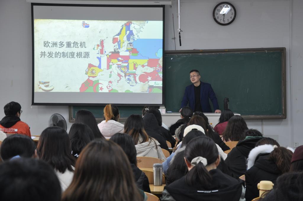 讲座伊始,桂老师围绕1913年成立的欧盟展开话题,以ppt的形式向同学们介绍了欧盟的各项政策,并指出欧盟在国际事务中影响力不断提高后,凭借欧洲一体化为维护二战后的政治秩序、制约霸权主义做出了重要表率,使同学们对欧盟的由来与发展有了基本的了解。紧接着,桂老师从精英欧洲正在被民众抛弃,执政者追求选票不思改革,盲目自信价值观,全民投票沦为政客玩弄的工具以及西方选举政治走入歧道这五个方面,详细地讲解了造成欧洲多重危机的原因。并通过叙利亚战争等案例,强调造成欧洲多重危机并发的根源在于民主政治制度遭遇的危机,鼓励同学们多学习了解国际政治形势,用理性客观的态度看待问题。(审稿人:高欢欢)
