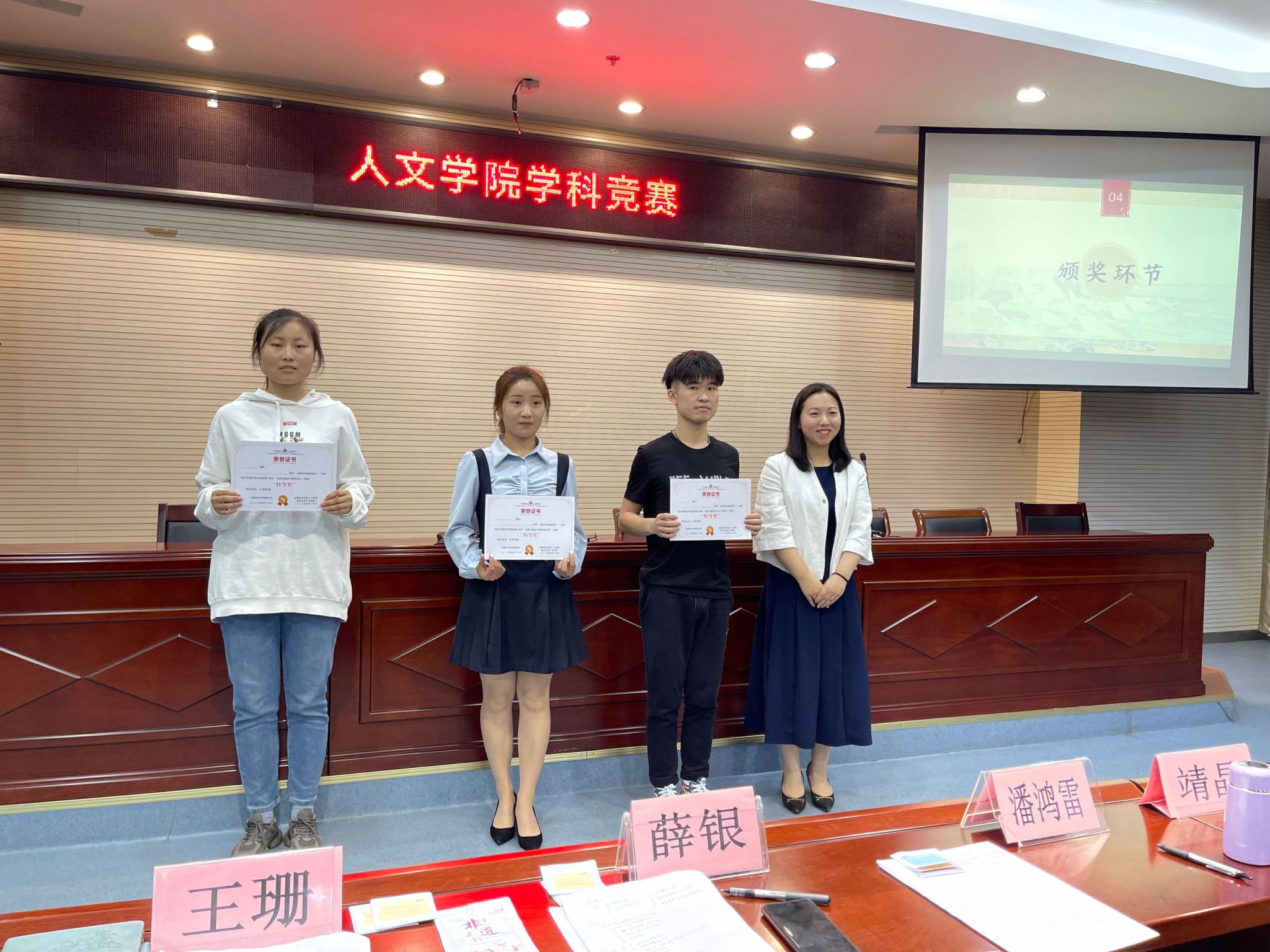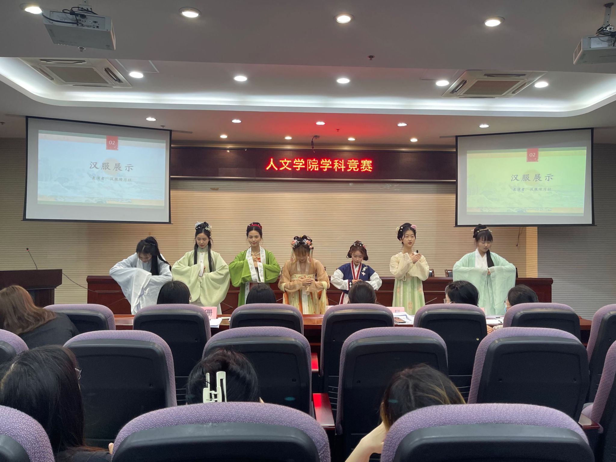 本次路演活动共选取了12份作品,按作品主题分成非遗研学旅游线路设计、非遗研学课程设计、非遗研学衍生产品设计3个组别,依次进行了汇报与展示。各组选手配合默契,上台汇报流利生动,结合相关文字、图片、视频、绘画、手工制作等,全方面向老师和同学们介绍了各自的参赛作品。值得一提的是选手结合非遗主题,身着中国传统服饰,进一步突出了展示主题。有的参赛选手现场表演了非遗皮影戏,其文白夹杂的台词,幽默风趣的配音,形象生动的演绎,吸引了全场老师和同学的目光,进一步加深了同学们对非遗的理解,将本次比赛推上了高潮。同时,为了深度契合本次比赛的非遗文旅主题,本次活动还特别安排了串场表演,邀请我院汉韵传习社同学们汉服展示表演《汉韵》,令现场观众眼前一亮。经过现场评选,最终《白云之下,布里生花》、《探寻秦淮河里的桨声灯影》、《“非”入寻常百姓家》赢得本次活动特等奖。另外评选出一等奖7名、二等奖12名,以及最佳现场奖项3项。