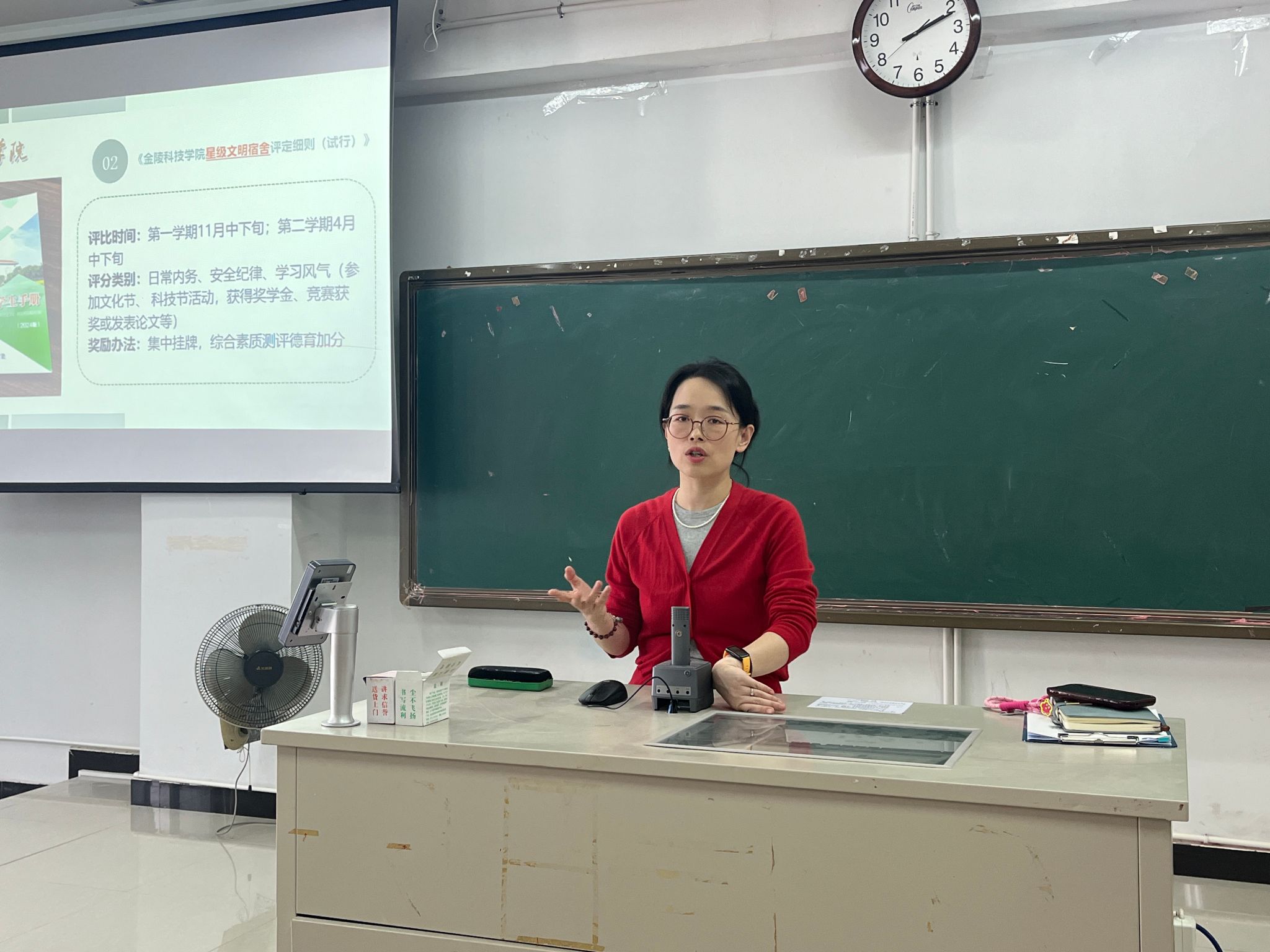 我院组织员彭媛老师、学工办主任童明明、副主任高欢欢、辅导员梅冬琴、靖晶、张琳老师围绕如何开展精彩的校园生活,从入党入团、校纪校规、生活方式、安全教育和奖学金政策等方面向新生们作详细介绍,帮助新生们更好地了解、适应大学生活,引导新生们合理规划校园生活,珍惜时光积极求学。老师们鼓励新生们在大学期间能够掌握适合自己的学习方法,认真学习专业知识和技能,积极参加各类学科竞赛、社会实践和技能证书考试,敢于挑战自我,培育健康心态,为个人的成长成才聚力蓄能。