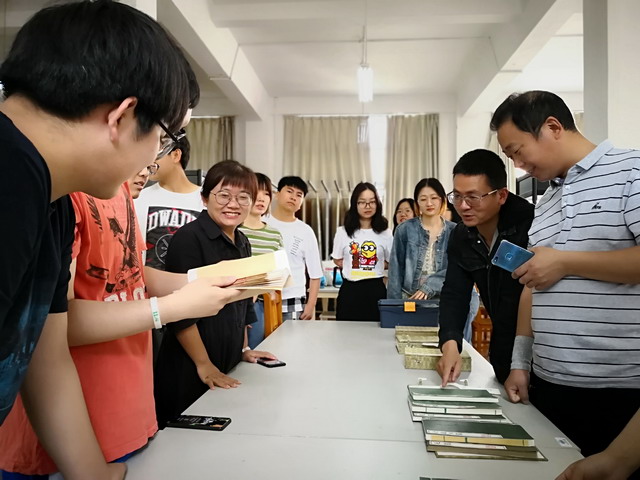 古籍修复专家周苏阳老师对册页、函套、装帧、古籍修复、书画装裱等作品进行了介绍,滨海职高和特校的老师一边欣赏,一边连连说“作品太精致了”。并对如何制作册页,以及册页中书画作品的嵌入,非常有兴趣,不时提出问题,古籍修复专业的同学一一予以细致解答。